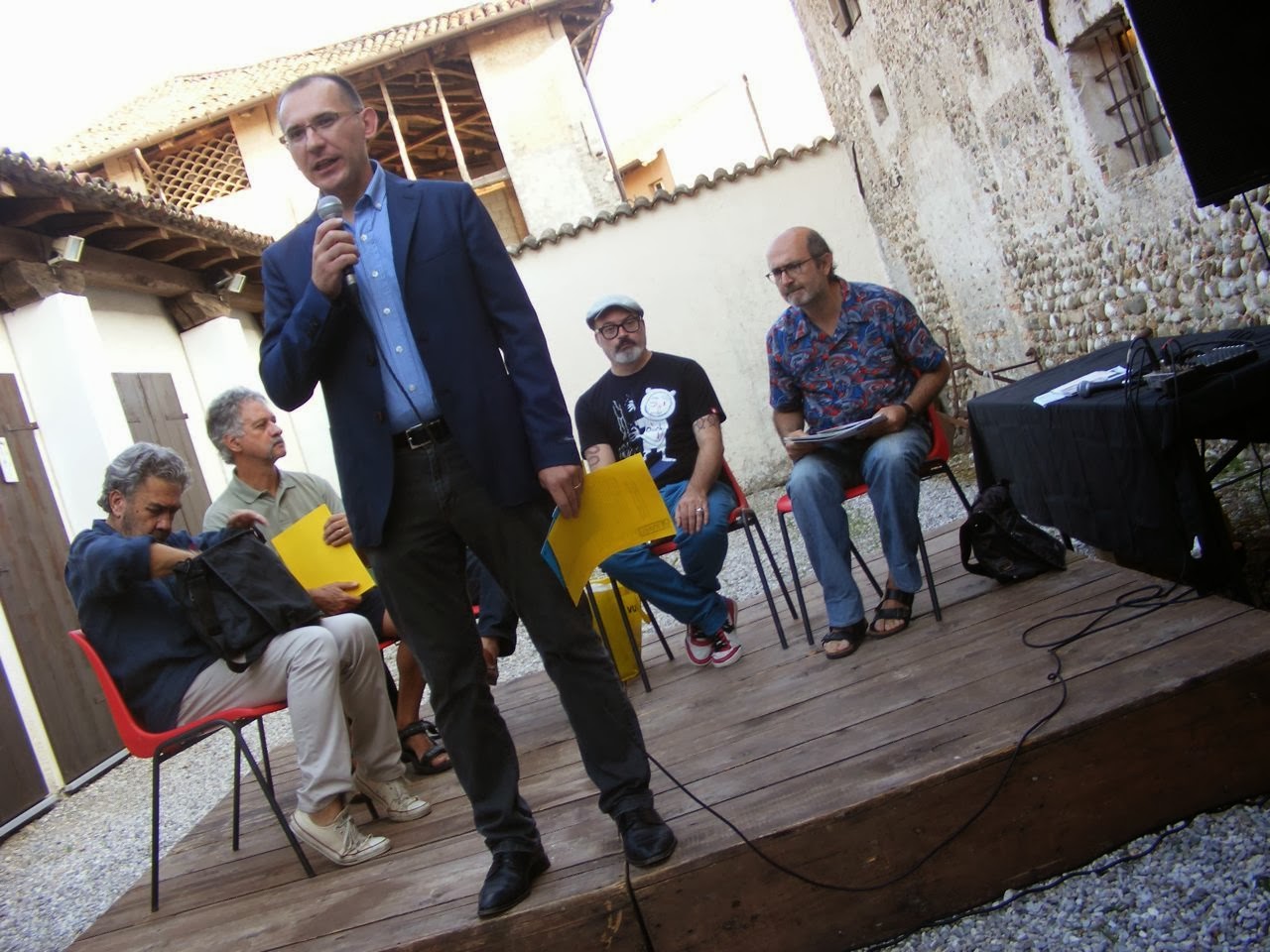 Brindisi con buon vino friulano: da sinistra Massimo Giacon, Vittore Baroni, Daniele Ciullini, Mimì Colucci, Emanuela Biancuzzi, Renato Rinaldi, Roberto Arbe Garbe.
